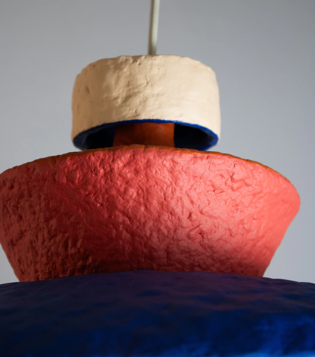 Composta por 4 partes, utilizamos os seguintes materiais: a cúpula é feita com nossa massa de celulose leve e moldada, a parte central do produto é feita de uma embalagem de marmita de isopor que costuma ser usada para delivery de comida e meia garrafa pet, enquanto o topo, a "cereja do bolo", é uma lata de atum. Tudo isso foi revestido com uma massa exclusiva, desenvolvida pela própria bekka studio, que utiliza a fibra renovável da celulose 100% reciclada e aglutinantes, resultando em uma massa resistente, durável e ecoeficiente.