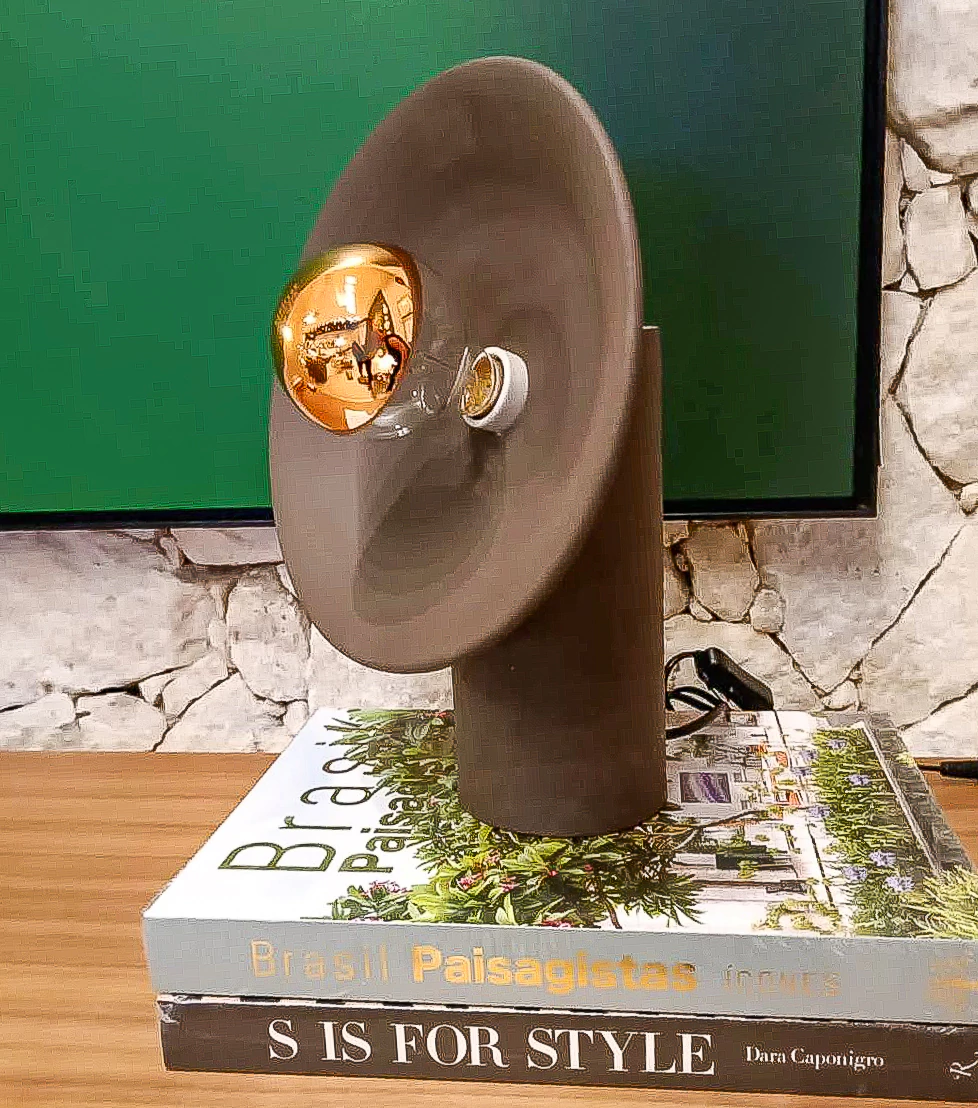 Sua base cilíndrica e sua aba circular são somados a uma lâmpada defletora, refletindo a luz de maneira indireta e criando um ambiente suave. Sua composição de elementos cria um design minimalista e sofisticado para qualquer ambiente.